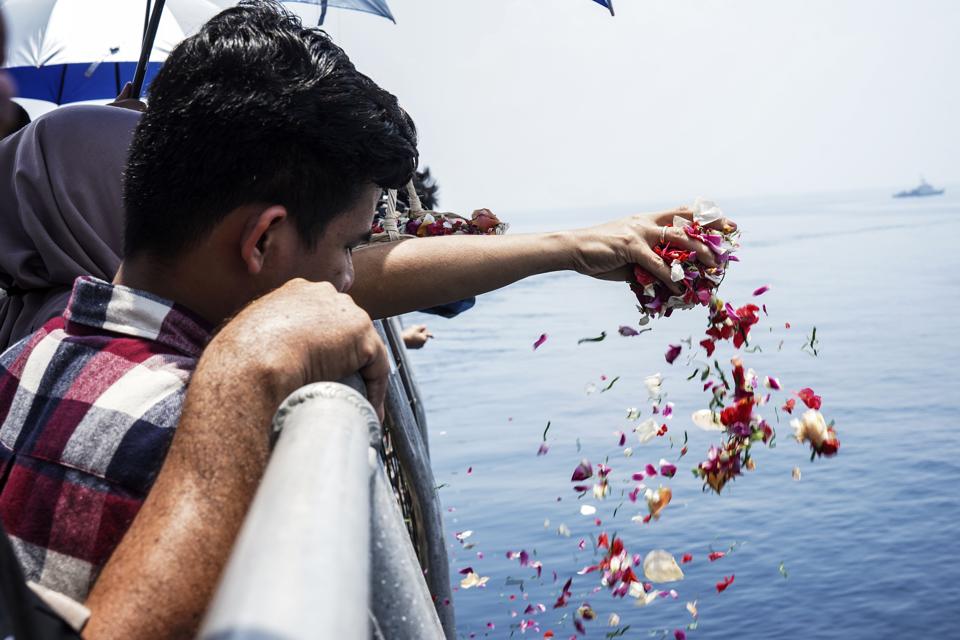 Relatives of the victims of the ill-fated Lion Air flight 610 toss flower petals into the water as ... [+]