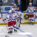 The New York Rangers are playing the Los Angeles Kings in a game.