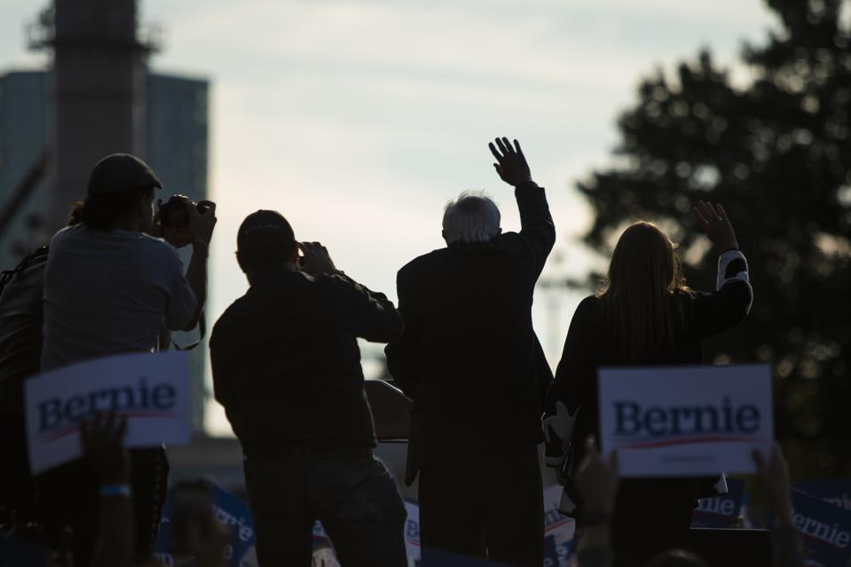 Democratic presidential candidate Sen. Bernie Sanders, I-Vt., waves to supporters during a rally on ... [+]