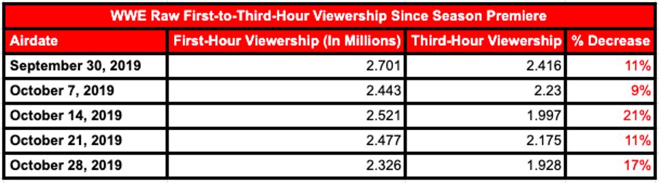 Unfortunately, WWE's desperate reliance on crash TV backfired as third-hour viewership shrunk to just 1.928 million, down 17% from first-hour viewership of 2.326 million. The 1.928 million viewers represents the lowest third-hour viewership since Raw's season premiere on September 30, and the second-lowest first-to-third hour drop in viewers in that same time span. As a whole, Raw's viewership came in as the third-lowest non-holiday Raw in modern history.