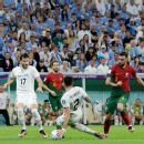 A somewhat dubious penalty was awarded to Portugal when Luis Suarez fell to the ground and the ball brushed past his hand after he put his arm out. After a video review, the referee decided it was a mistake.