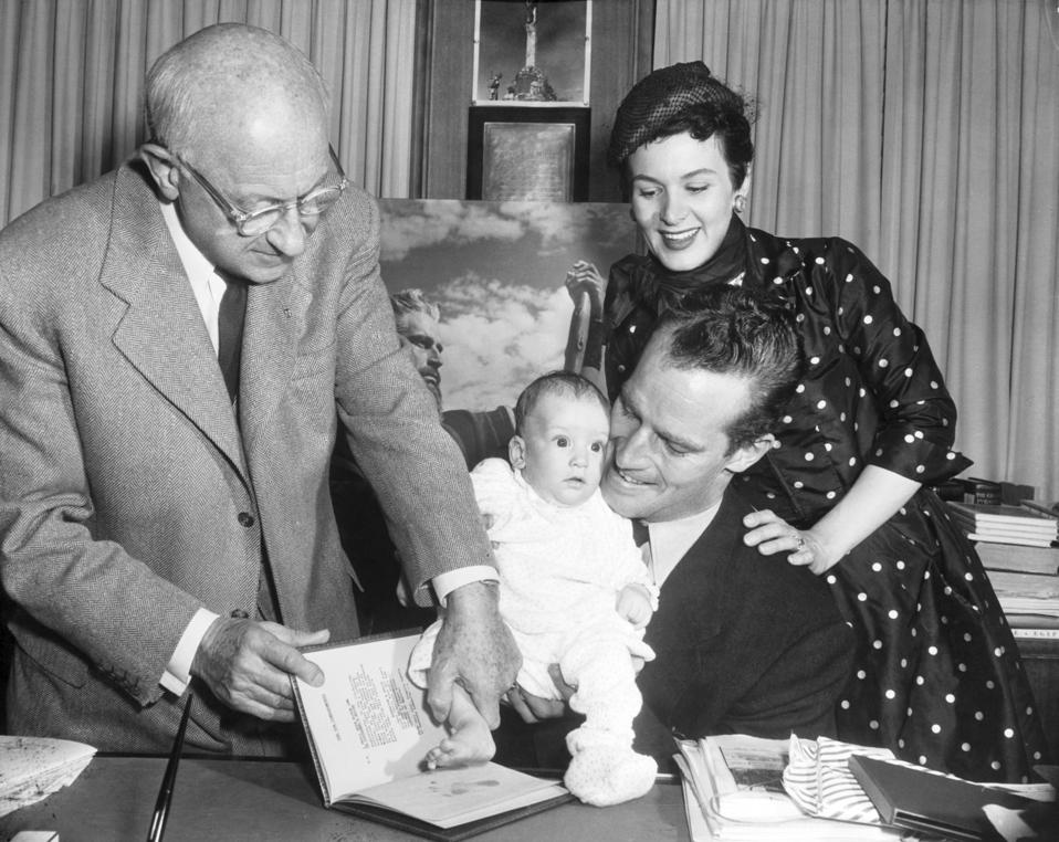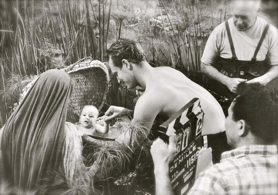 Fraser Heston as Baby Moses with his father, Charlton, on the set of 'The Ten Commandments.'