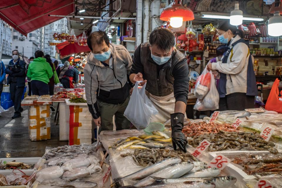 Shoppers in a Hong Kong wear protective masks to purchase seafood in a market.