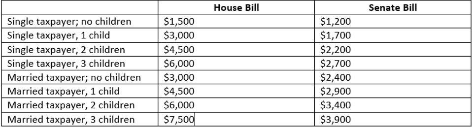 Rather than bury the lede, below is a summary of the amounts you could expect to receive in the coming months under either the House bill or the Senate bill.