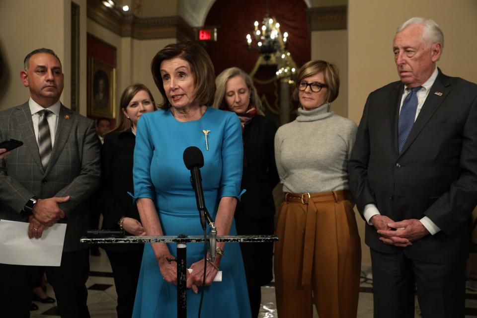 U.S. Speaker of the House Rep. Nancy Pelosi (D-CA) speaks to members of the media as Rep. Gil ... [+]