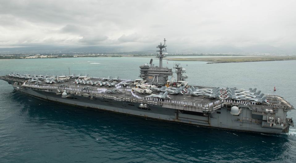 Aircraft carrier USS Theodore Roosevelt arrives in Pearl Harbor, Hawaii in 2018.