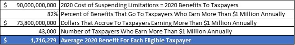 This number represents an average (mean) and clearly not all of those earning "only" $1 million will receive a $1.7 million tax cut; however, just as some may receive less than the $1.7 million, some may benefit much more. The numbers may be closer to the truth because of additional language that applies the policy retroactively " so losses in 2018 and 2019 can be 'carried back' against the past five years."