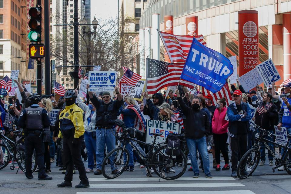 People held signs during a protest demanding to reopen the Illinois economy, hit hard by ... [+]