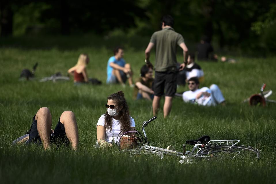 People are sitting on the lawn at crowded Parco del Valentino in Turin, Italy during the first ... [+]