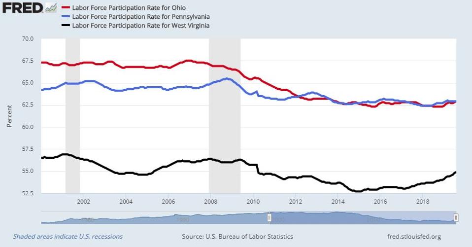 Not only was West Virginia's LFP rate the lowest of any state in August 2019, it is consistently one of the lowest in the country and substantially lower than neighboring states Ohio and Pennsylvania, as shown in the figure below. Since 2000, the labor force participation rate in West Virginia (black line) has been seven to ten percentage points lower than the rates in Ohio and Pennsylvania. Fewer people working means less output and thus a lower standard of living. A smaller workforce also puts stress on government budgets since it typically means more people receiving some sort of government assistance and less tax revenue.