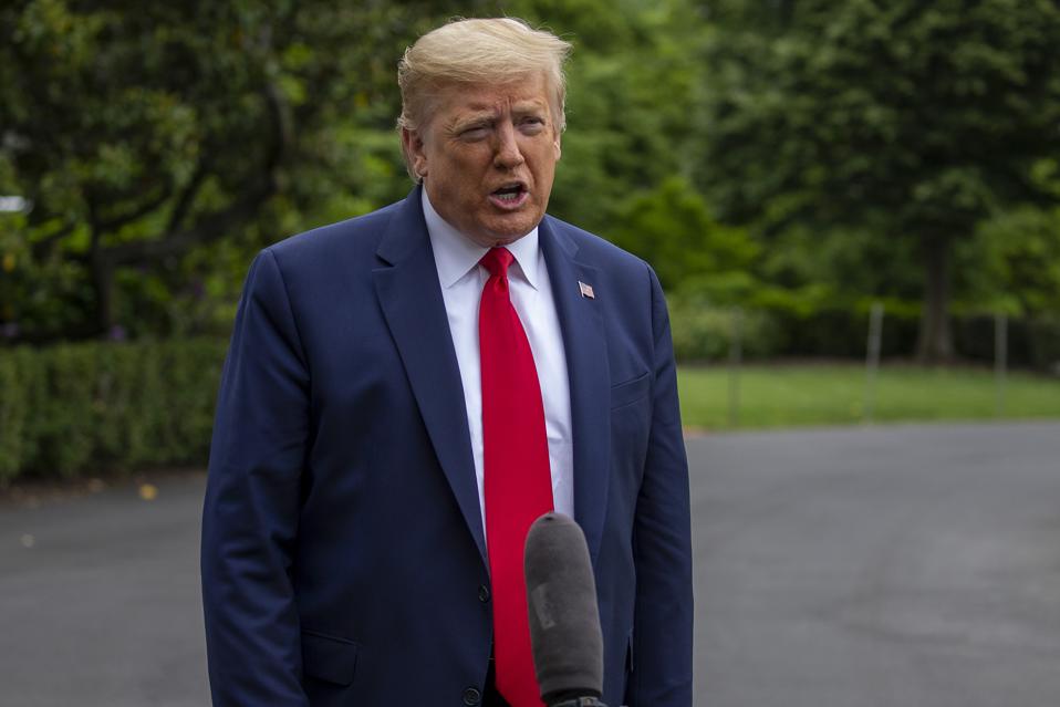 President Donald Trump talks to the media after landing on the South Lawn of the White House on May ... [+]