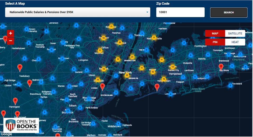 Using our new interactive mapping tool, quickly review (by ZIP code) the 290,304 New York public employees and retirees who earned more than $100,000 and cost taxpayers $38 billion (FY2018-9). Just click a pin and scroll down to see the results rendered in the chart beneath the map.