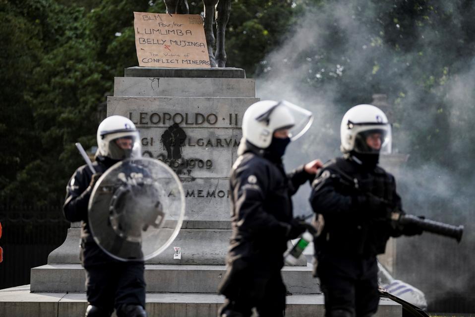Riot police protect the King Leopold II of Belgium statue during an anti-racism protest, in ... [+]