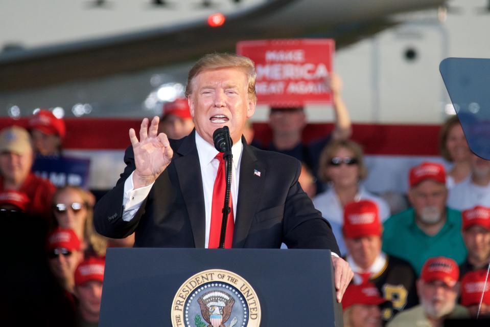 US President Donald J Trump holds a MAGA rally at the Williamsport Regional Airport, in ... [+]