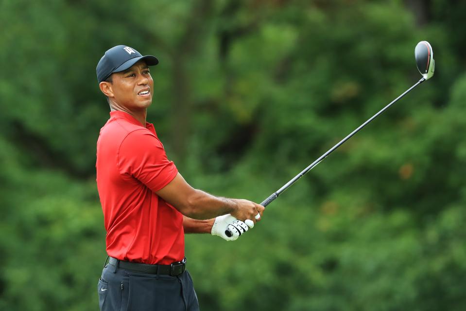 MEDINAH, ILLINOIS - AUGUST 18: Tiger Woods of the United States plays his shot from the fifth tee ... [+]