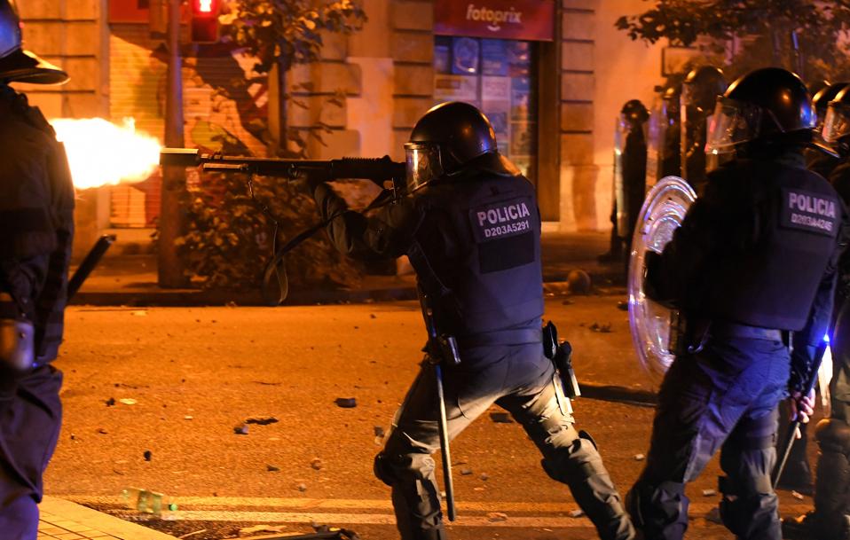 The main cities in Catalonia have seen street battles between the hooded pro-independence radical groups and the police. Some demonstrators set up flaming barricades, burned rubbish containers and cars, and hurled firecrackers at riot police, who fired foam bullets and charged towards protesters in response.