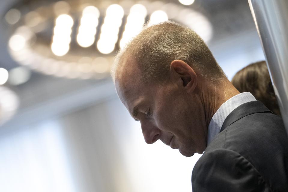 Boeing CEO Dennis Muilenburg waits to speak at an Economic Club Of New York event on October 2, 2019 ... [+]