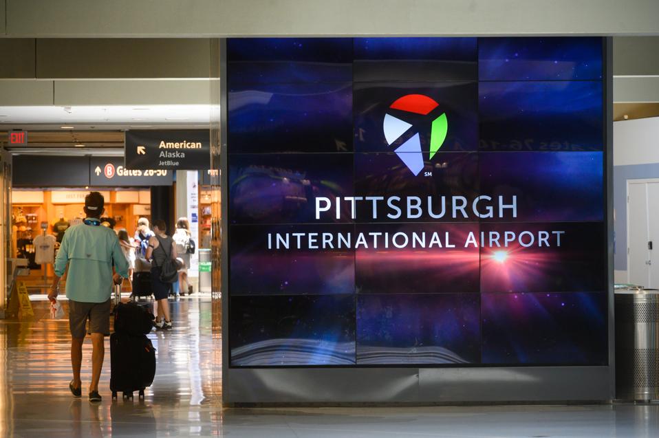 A traveler moves luggage past signage at the Pittsburgh International Airport (PIT) in Moon ... [+]