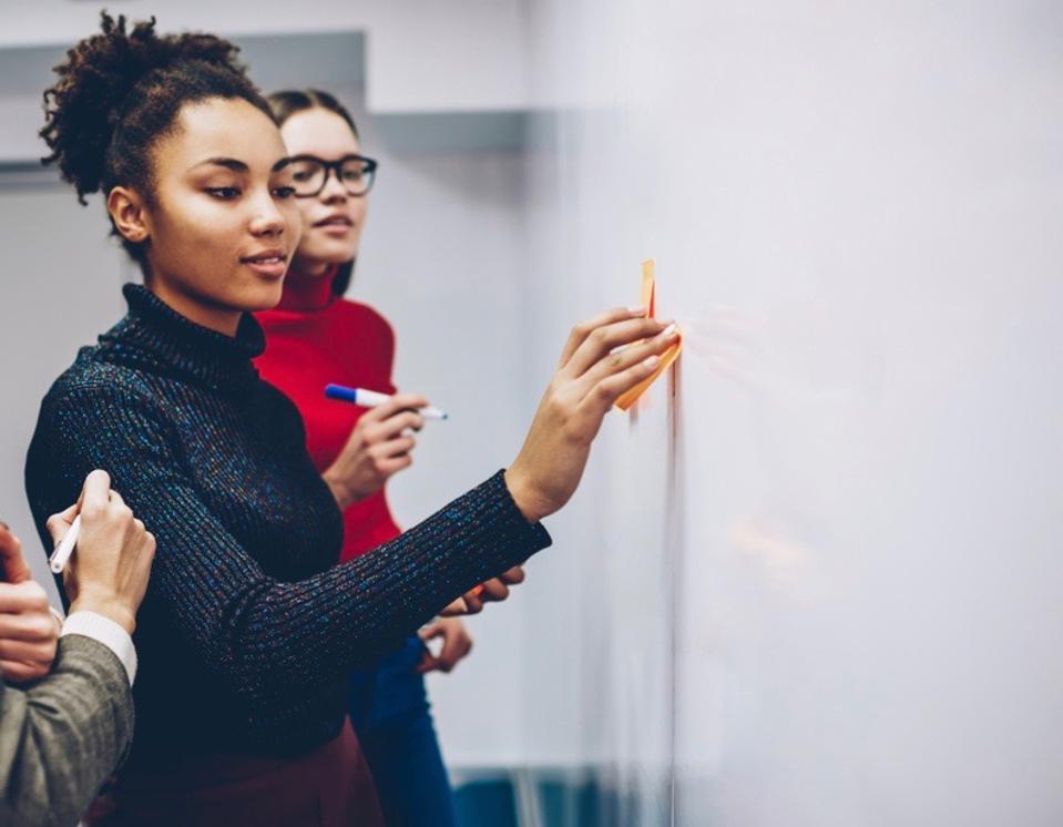 To get people in the habit of collaborating early and often, try a technique called Sharing Works in Progress. It's designed to make us feel less possessive of our ideas and to leverage the expertise of others. Start by dividing the room into teams and providing a flip chart and a bunch of sticky notes to each team.